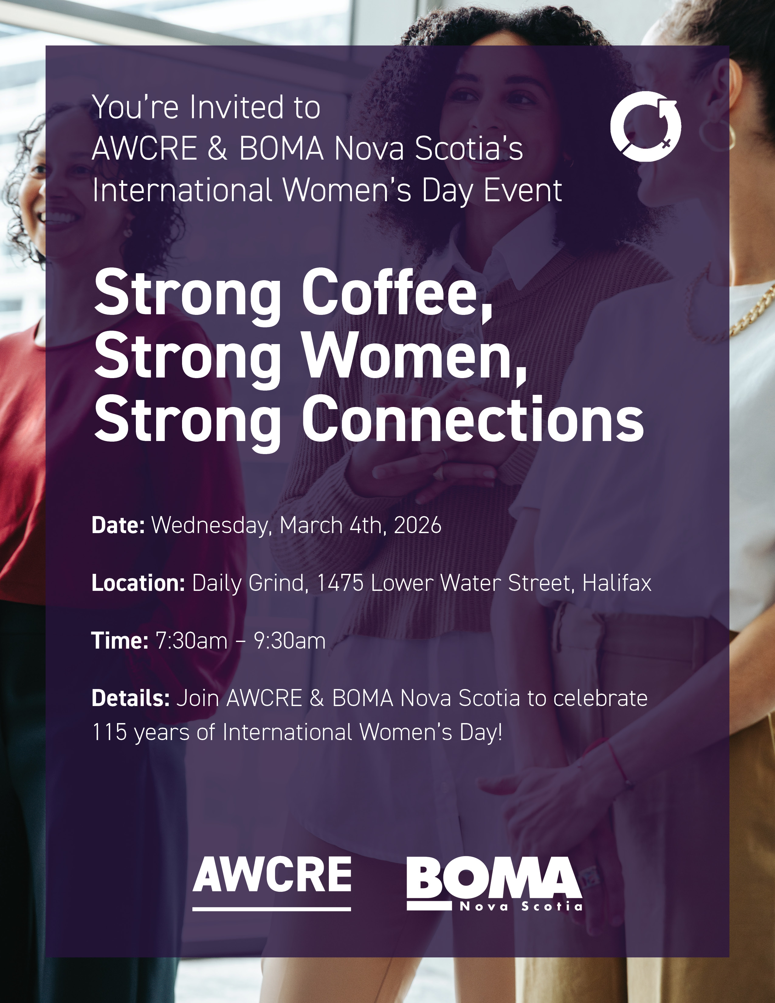 Are you a woman working in commercial real estate in Nova Scotia? We invite you to join us for this International Women’s Day event in collaboration with AWCRE! Drop in to The Daily Grind on Wednesday, March 4th, for connection and conversation with fellow women in the commercial real estate industry and celebrate 115 years of International Women's Day! This event is free to attend and is exclusive to BOMA NS and AWCRE members.